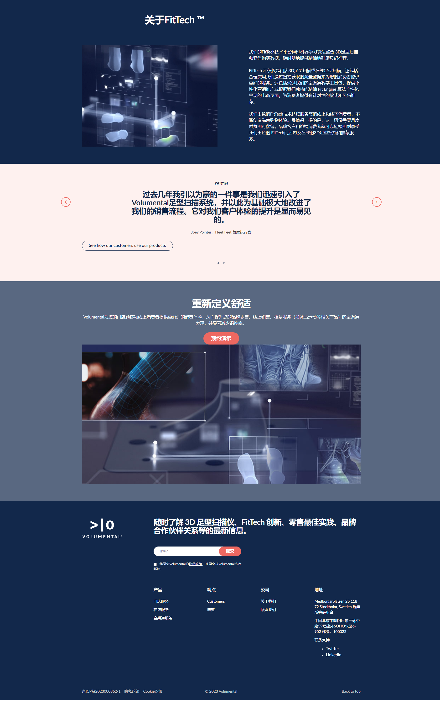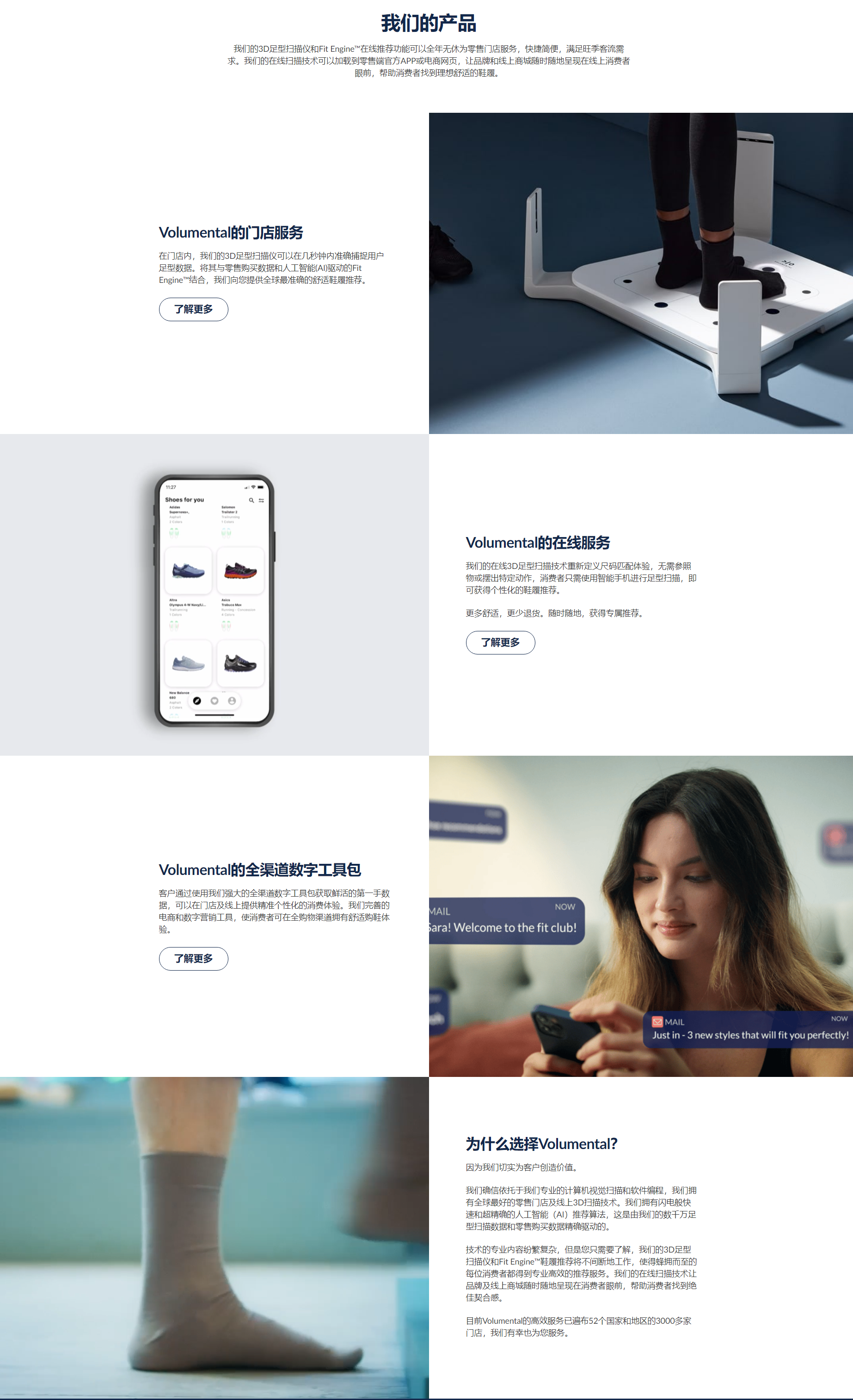Volumental FitTech平台整合3D扫描和大数据技术,不断优化匹配度。融合了为消费者进行鞋码推荐所需的全部工具。产品将为您的零售扫描、在线扫描、个性化推荐和数字营销提供专业的高效赋能方案。 FitTech技术平台通过机器学习算法整合 3D足型扫描和零售购买数据,随时随地提供精确地鞋履尺码推荐。 目前Volumental的高效服务已遍布52个国家和地区的3000多家门店