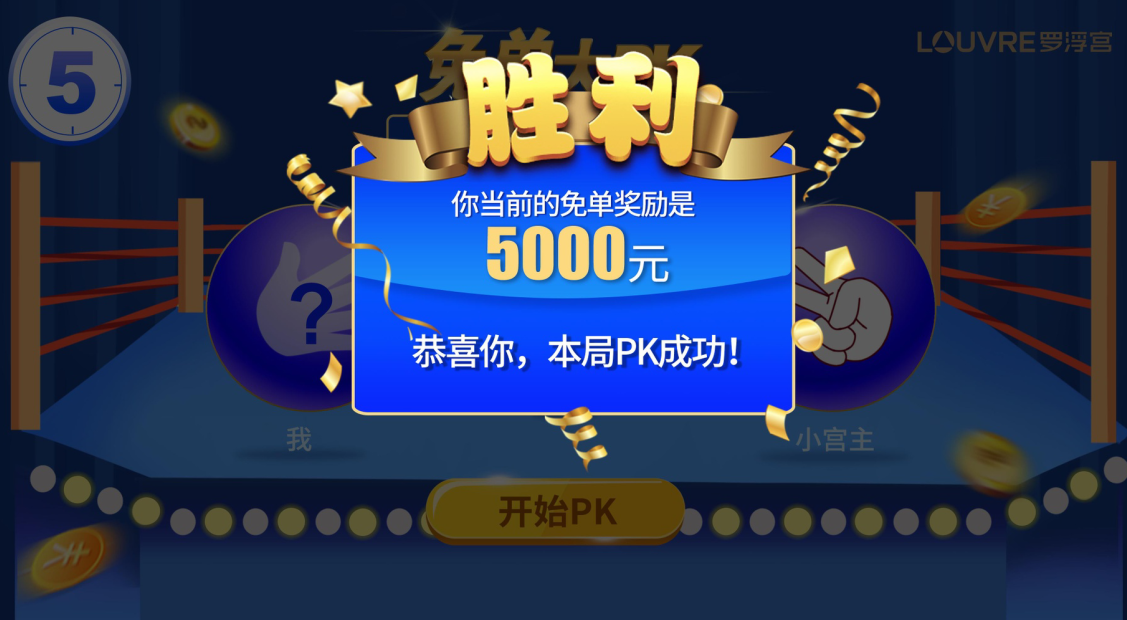 2.在限定时间内完成5轮对决;(限定时间可设置,顾客必须在每局限定时间内完成游戏,否则输掉本局。)